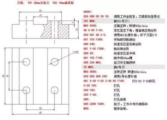 概念三 常用指令类型 指令的格式为英文字母+数字构成。 如G54G_ X_Y_Z_ F_ S_ T_ M_ G_ G代码 X_Y_Z_ 机床的直线轴 F_ 进给速度 S_ 主转转速 T_ 刀具指令 M_ 辅助功能 最常用的M代码 M3 主转正转 M4 主转反转 M5主转停转 如:M3 S600 主轴正转,转速600 r/min M06 换刀指令 如 T1 M06 就是换一号刀 以下重点讲G代码 01组G代码 用于控制刀具的运动。 G00 快速点定位 G00 X_Y_Z_ ; 刀具以快速度移动至 以绝对值指令(G90)或增量值指令(G91)所指定的工件坐标系中的位置 移动速度由机床参数所指定 G01直线插补 G01 X_Y_Z_ F_ ; G02顺时针圆弧插补 指令格式:G02 X_ Y_ Z_ R_ F_ / G03 X_ Y_ Z_ I_ J_ K_ F_ G03逆时针圆弧插补指令格式:G03 X_ Y_ Z_ R_ F_ / G03 X_ Y_ Z_ I_ J_ K_ F_ X_ Y_ Z_ 圆弧的终点坐标 R_ 圆弧的半径 I_ 圆弧的终点相对于刀具所在位置X向的位置 J_ 圆弧的终点相对于刀具所在位置Y向的位置 K_ 圆弧的终点相对于刀具所在位置Z向的位置 F_ 进行速度 F的定义方式有两种 G94 每分钟进给(刀具每分钟移动速度 mm/min/ G95 每转进给(主轴每旋转一转刀具移动的距离mm/r) 05组G代码 G94 每分钟进给 G95 每转进给 03组G代码 G90 绝对值指令 编程时编制终点坐标 G91 增量值指令 编程时编制刀具移动的方向与距离 对于这三组指令,从字面上比较难理解,不明白的地方可以加入我的数控QQ群122561460,在里面讨论,也可以下载我做的PPT 和Flash动画。 08组G代码 刀具的长度补偿 G43 长度补偿指令 如 G43H01 在换刀点刀尖到工件Z向零点的距离为“H01”,什么是“H01”?H01就是偏置值,也就是我将刀尖到工件Z向零面的距离写在偏置表里的H01处。 14组G代码 用于设定工件坐标系,也就是零点的位置 G54 1号工件坐标系 我们将工件零点的位置,写到坐标系列表中。G54只是列表中最常用的位置。其他的还有G55 G56 G57 G58 G59 等等,他们的意义和G54相同。 09组G代码 打孔、镗孔、铰孔时用的G代码。 G81 格式为 G81 X_ Y_ Z_ R_ F_; X_Y_ 孔位坐标(也就是孔的位置) Z_ 孔的深度 R_ 安全高底,也就是高具移动到什么位置时开始进给运动? F_ 进给速度。 G80 固定循环结束 09组G代码还有很多,G81 G83 G84 G85 G86 G87 G73 G74 G76等等。每个一指令的动作都不太一样,但掌握一个了,其它的看一下说明也就明白了。 好了。了解了这些入门的编程知识。重要的就是实际操作了。结合自己手头的数控车床,加工中心机器。实际操作一把。看看能不能深入体会。